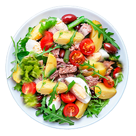 Salade verte, tomates, thon, oeuf dur, olives, pommes de terre.