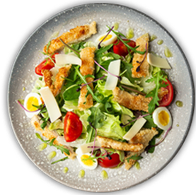 Salade verte, tomates, poulet, oeuf dur, maïs, pommes de terre.