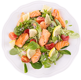 Salade verte, tomates, saumon, citron, crème fraîche.