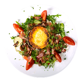 Salade verte, tomates, lardons, chèvre, croûtons.