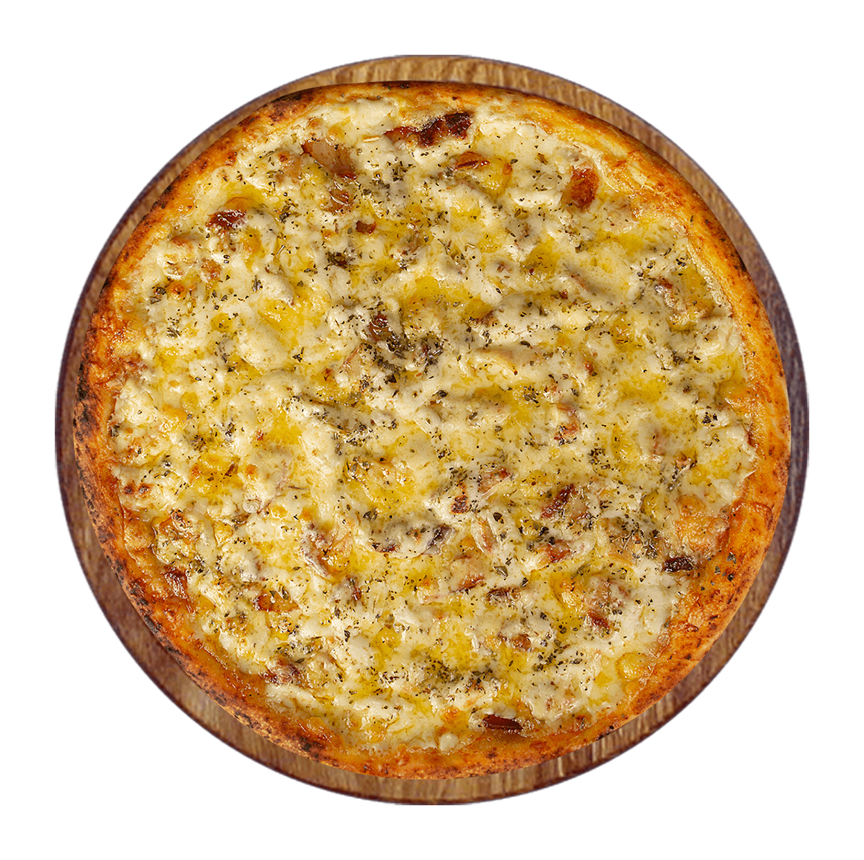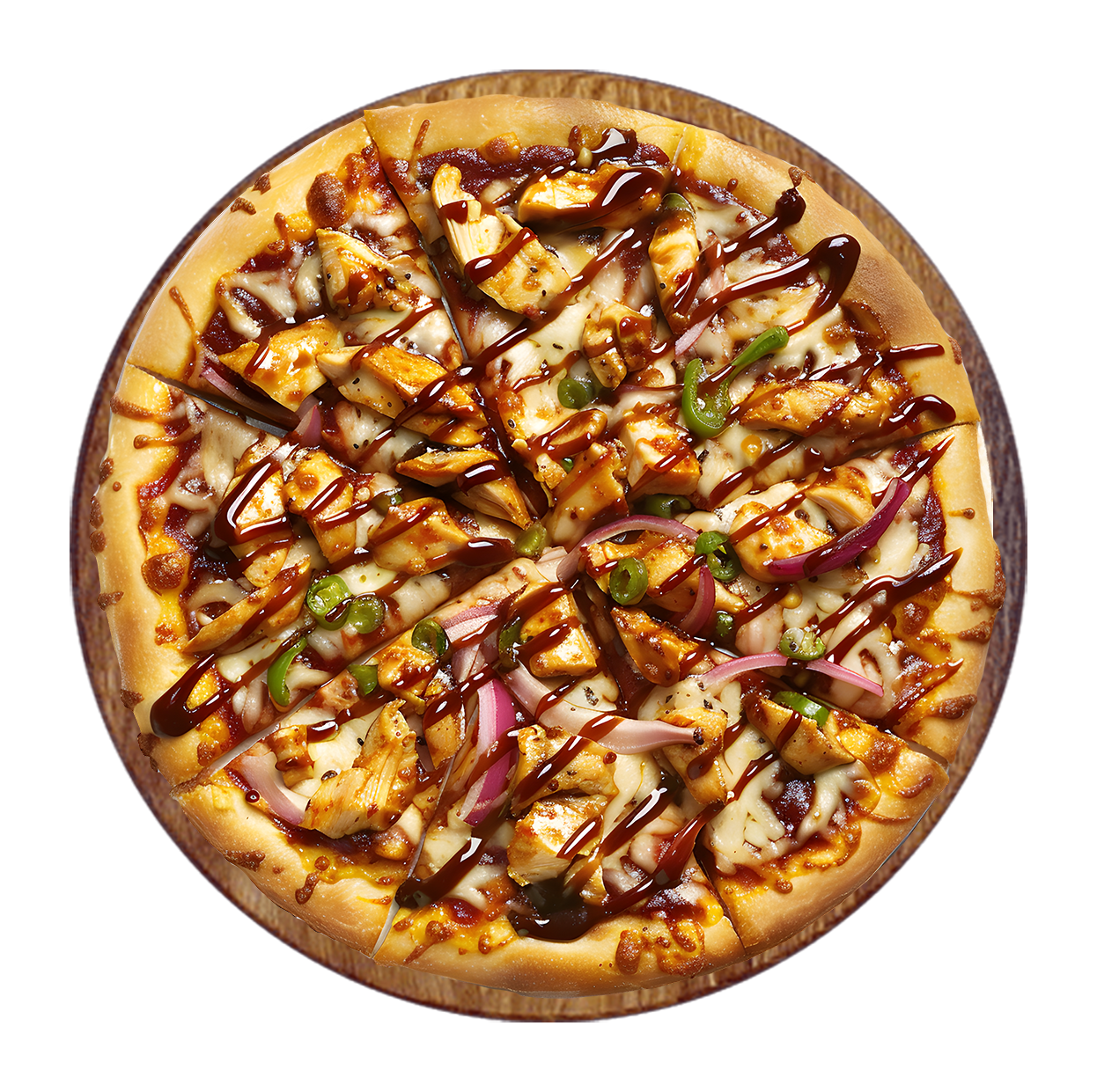 Sauce tomate, mozzarella, sauce barbecue, poulet, poivrons, oignons .